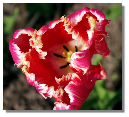 Tulip "Lucky Parrot" has petals which resemble feathers with finely ruffled edges.