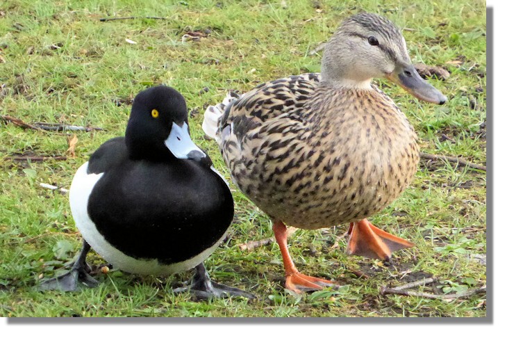 That's a young male Tufted Duck on the left and a female Mallard Duck on the right. The reason I took the picture was because of the strange behaviour of the Tufted Duck - it kept sidling up beside the Mallard and when she moved away the Tufted Duck continued to follow. If they had been the same breed I would have thought it was just the male "Tufty" making overtures to a female friend. But two different species of duck don't usually inter-breed.