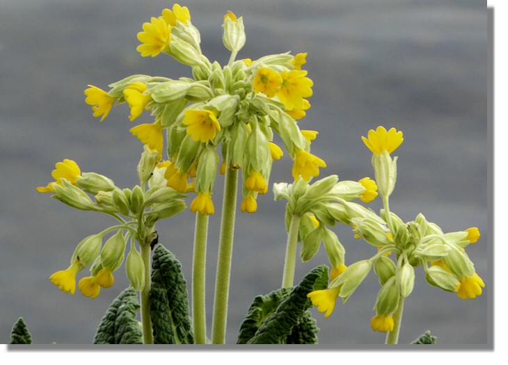 Primula veris (also known as cowslip, common cowslip and cowslip primrose is one of the large family of primroses. The plant frequently grows on boggy, slippery ground which may have been the origin of its name. The flowers grow on long stems and produces clusters of 10 to 30 blooms on one stem. Traditionally, its leaves have been used as a salad green in Spain and in the UK it is sometimes used to flavour country wine.