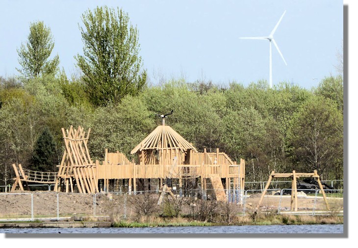 The lochs at Drumpellier, like a number of others in North Lanarkshire and nearby in Glasgow were formed during the last Ice Age as the ice sheet gouged out depressions When the ice later melted they filled with water creating small lochs. Research by archaeologists at Drumpellier found under the water the remains of a "Crannog" - a type of wooden dwelling built on stilts and with a wooden causeway linking to the shore. Using the Crannog design as a starting point, the North Lanarkshire Parks Department decided to build a wooden building resembling one of these ancient structures. But unlike the Crannog reconstruction at Loch Tay in Perthshire, this structure is being built on dry land - and will be a children's adventure play area with, it seems, metal chutes for the kids to slide down. I rather liked this graphic with the design of the building from several thousand years ago and the modern wind turbine behind!
