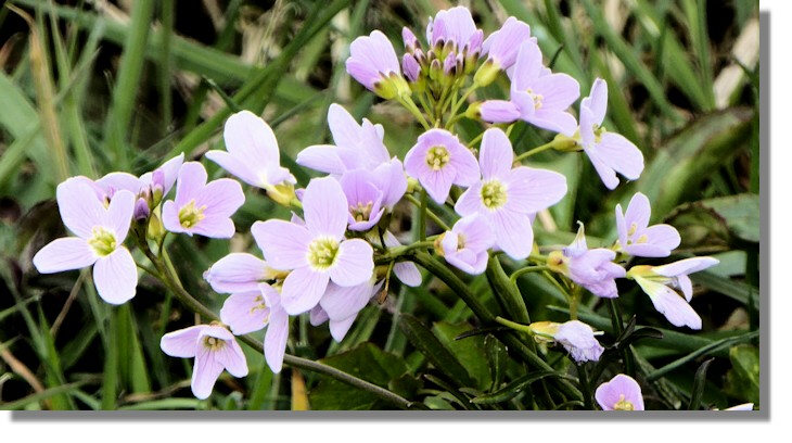 Cuckoo Flower - also known as lady's smock or by its botanical name Cardamine pratensis, grows to 40/60 centimetres tall with small pink (sometimes white) flowers and it prefers to grow near water - and there's plenty of that at Hogganfield Loch. The name of the plant is said to derive from the fact that it comes into bloom at around the time the cuckoo bird arrives in the UK (though that could be applied to many other spring flowers! Cuckoo flowers are a favourite food plant for Orange Tip butterflies which start flying around the Cuckoo flower comes into bloom.