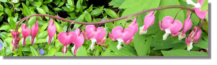 Dicentra Spectabilis, often known as bleeding-heart for obvious reasons, is a perennial flowering plant with curved branching flower stems. It tolerates being grown in shady locations (this one has a garage wall on one side and the wall of a house on the other). Despite that, it reliably produces an excellent quantity of flowers every year without the need for any effort on my part!