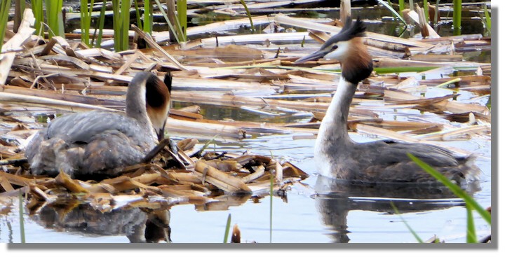 These two Great Crested Grebes are quite definitely mates as we have seen them at other times performing the intricate courtship dance, ducking and weaving and presenting pond weed to one another with the male bird fluffing up its head feathers. They have constructed their rather basic nest of a few dried reeds - it's a miracle that any eggs actually survive to form the next generation!