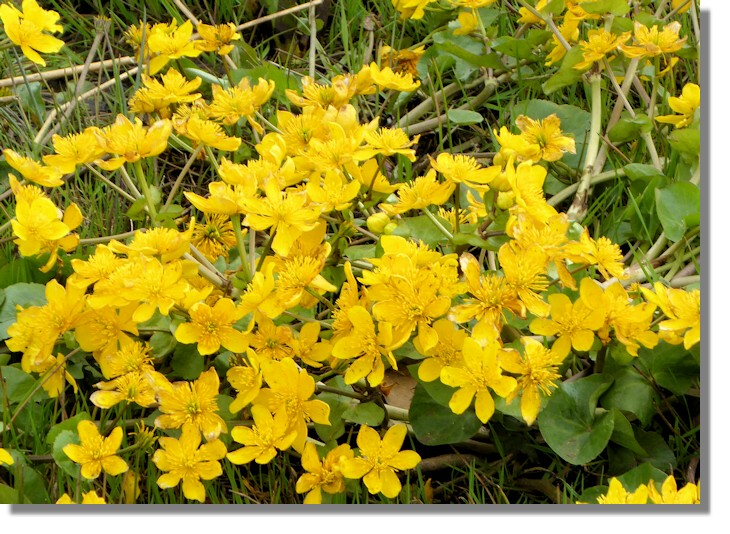 The boggy nature of areas near the loch is ideal for some plants such as Marsh Marigold (also known as Kingcup or its "proper" name Caltha palustris). Its flowers are quite small though larger than buttercups. In the right conditions, however, it soon spreads to create a golden carpet at this time of year. The proper name of "Caltha" is derived from the ancient Greek word for a goblet.