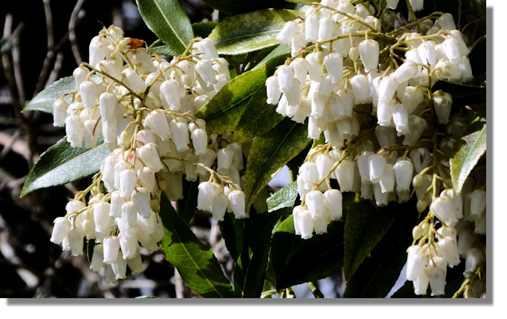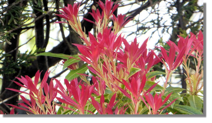 Pieris "Forest Flame" is a great shrub - it not only has dark evergreen leaves but the new leaves are initially a bright red colour turning pink, then cream and finally green. But the shrub also produces large clusters of small cream, bell-shaped flowers. (See next graphic)