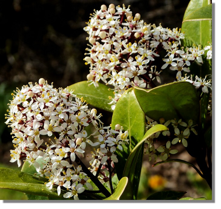 As its name implies, Skimmia Japonica originated in Japan but also in China and south-east Asia. It can grow eventually to 20 feet tall (although some cultivars have been produced which remain more compact. It has glossy evergreen leaves which is always good in winter time. Some varieties also produce small clusters of red berries.