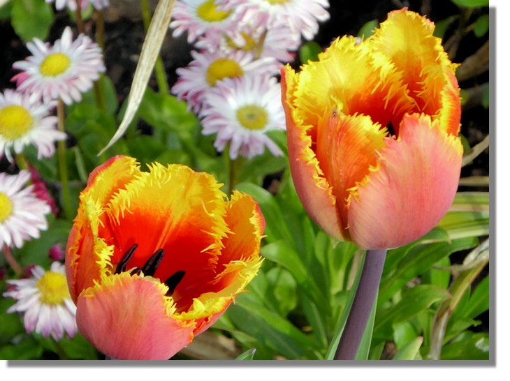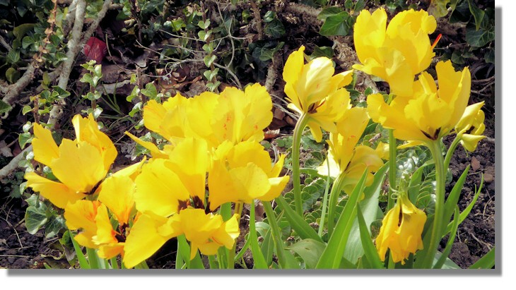 Although there are plenty of daffodils still in bloom (though many have already over) the later flowering bulbs such as tulips seen here are showing off the range of colours and form which are available nowadays.