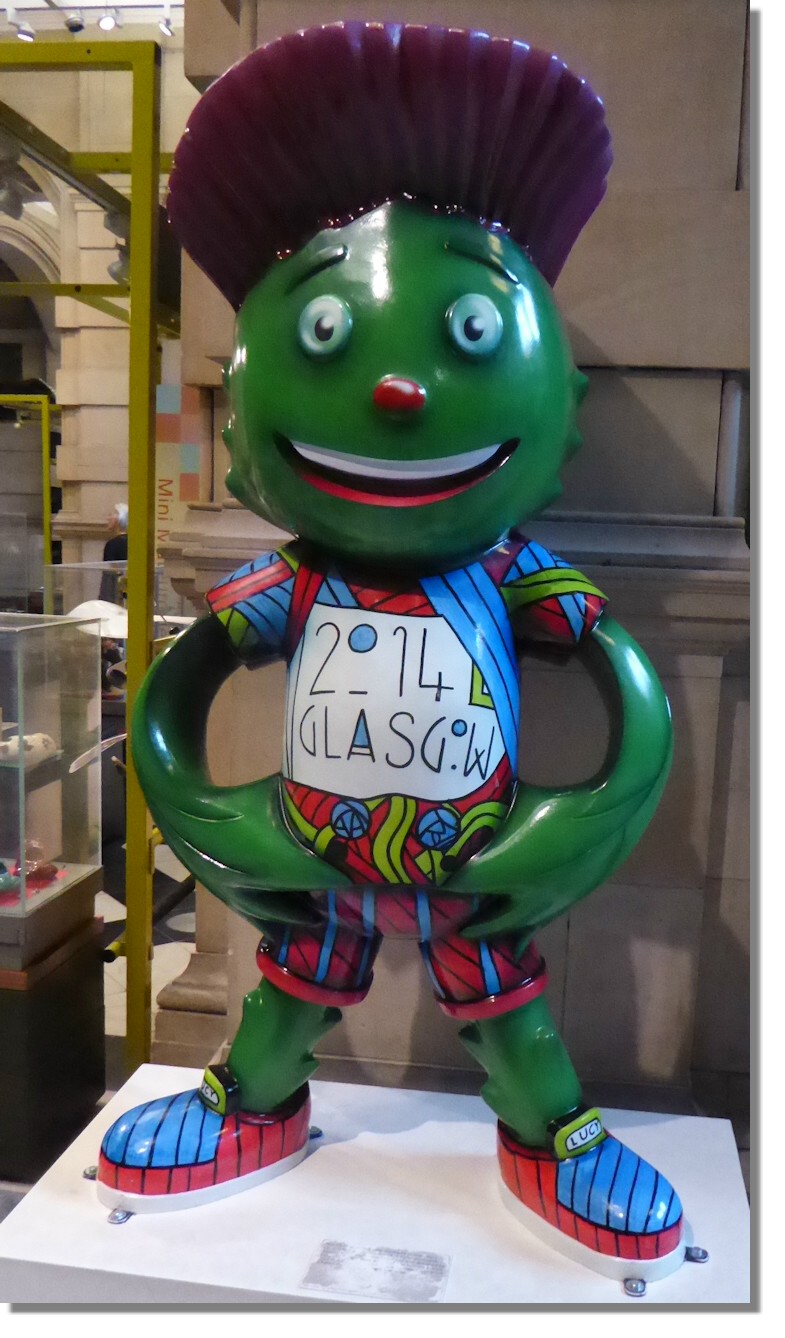 The mascot of the Commonwealth Games held in Glasgow was the multicoloured "Clyde" with his purple thistle-like hair and broad smile welcoming all the visitors to the city. Smaller replicas of Clyde were big sellers during the summer of 2014 and the shops ran out of stock (as I discovered when I attempted to obtain these souvenirs for my grandsons!)