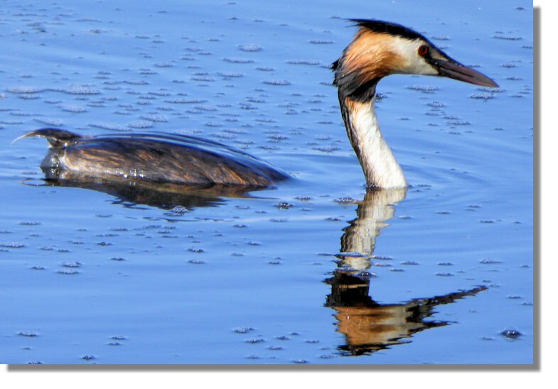No mistaking the sleek lines and colours of an adult Great Crested Grebe. The Grebe is one of those "now you see it, now you don't" birds as it constantly dives down to catch fish before bobbing up again some distance from where it started.