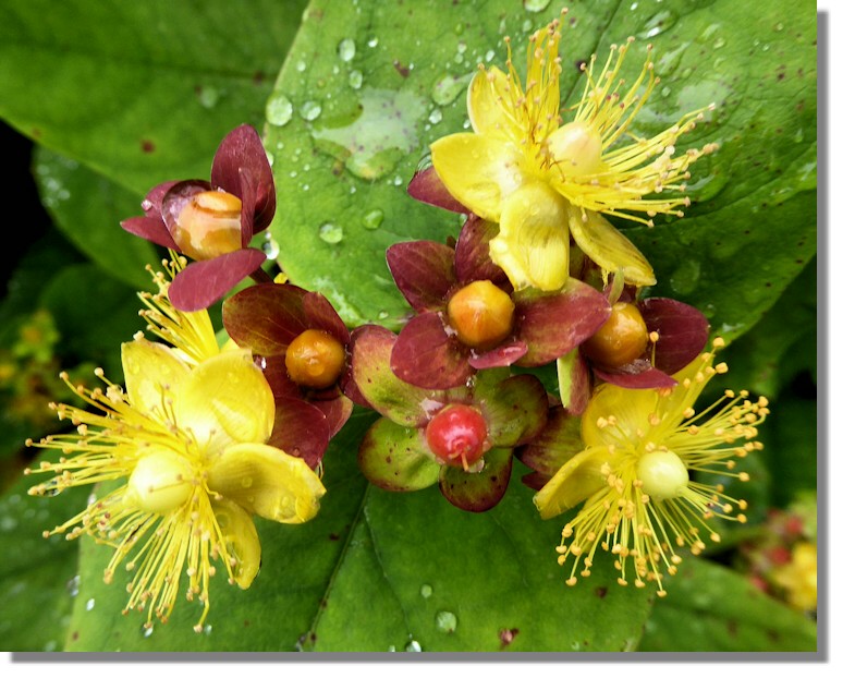 Clear skies in September created the conditions for moisture to gather on plants by morning and this hypericum (Rose of Sharon) has water droplets as well as flowers and berries to make a typical autumnal picture