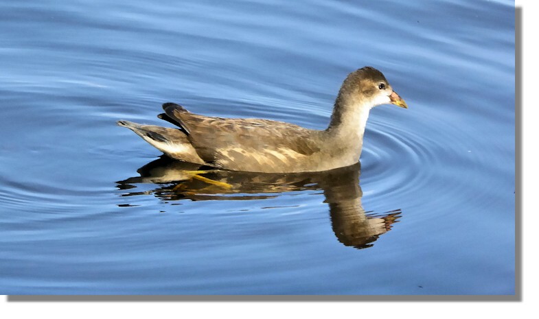 Identifying young birds before they develop the feathers and characteristics of the adult birds can sometimes be a challenge. There were two birds like this one swimming among the reeds at the side of the loch at Drumpellier Country Park in North Lanarkshire. After searching the bird books we eventually concluded that this was a junior Moorhen.
