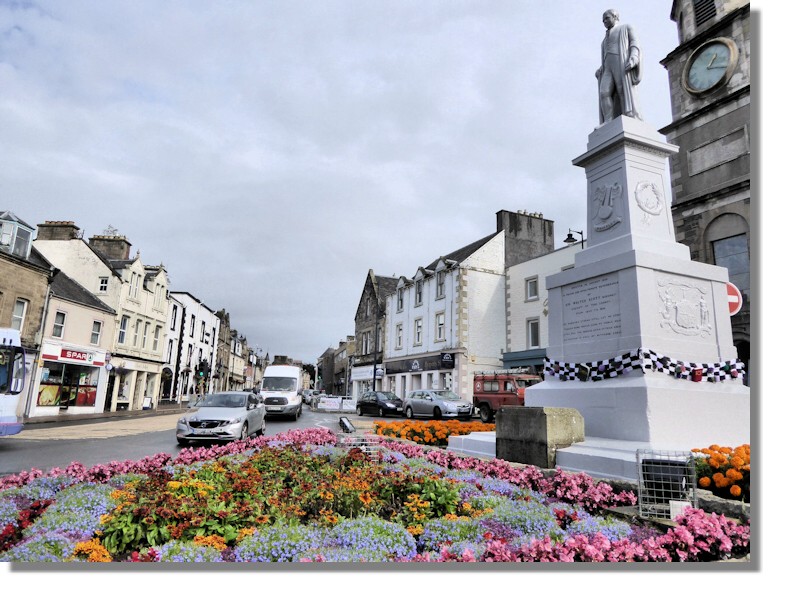 This is the main street in the Scottish Borders town of Selkirk. It always seems to have a colourful display of flowers like this, overlooked by a statue of Sir Walter Scott who is strongly associated with Selkirk. In December 1799, Walter Scott became the new sheriff-depute of Selkirkshire. and sat in a local court in the town. The building - behind his statue, is now a museum which includes a mock-up of the court, with Sir Walter presiding.