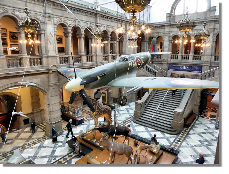 The Supermarine Spitfire hanging from the loft ceiling of one of the display halls in Kelvingrove is an impressive sight. The aircraft, a Spitfire F Mk21 flew with 602 Squadron from 1947 to 1949. It was used in the Battle of Britain film. It has been on display since July 2006 after the reopening of Kelvingrove Art Gallery and Museum Glasgow but was at the former Transport Museum in Glasgow before that.