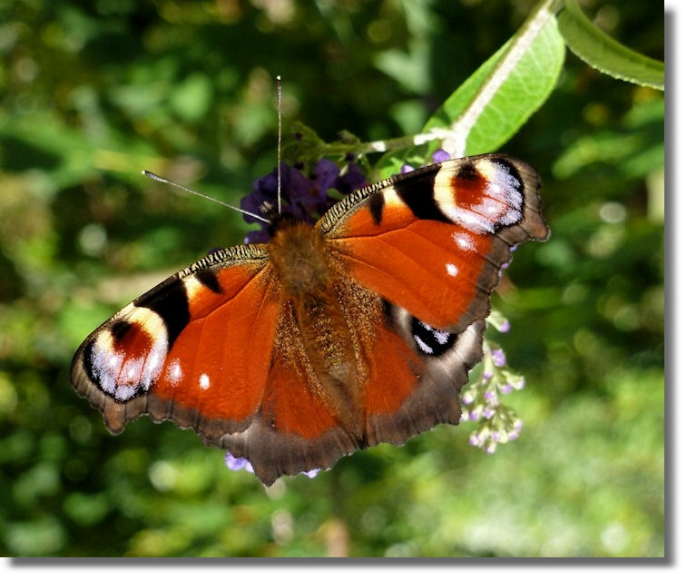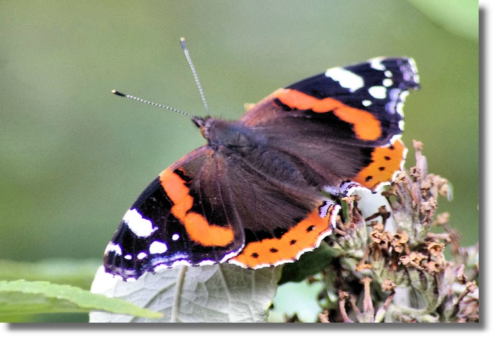 The Red Admiral butterfly is resident only in warmer areas, but migrates north in spring, and sometimes again in autumn. Its name is derived from the 18th century when it was known as "admirable". It is a large (wingspan 6cm /2.4 inches), strong-flying butterfly, common in gardens and found throughout Britain and Ireland. This large black butterfly, with a flash of vivid orange-red across its forewings and around the edge of its rear wings and a splatter of white spots towards its wing-tips, is a common sight in Scottish gardens during mid to late summer. They are often found feeding on garden Buddlejas, Michaelmas Daisy or flowering Ivy and rotting fruit in gardens and orchards during late summer/early autumn. Sightings of the Red Admiral can continue well into November on sunny days and some are thought to overwinter and are sometimes to be seen (mainly in the south of England, rather than Scotland) during December, January and February when almost all other species of butterfly are unlikely to be seen.