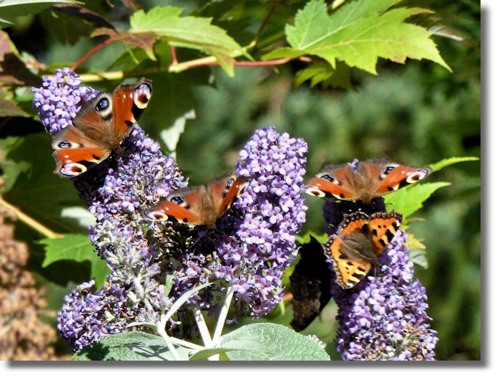 As noted earlier, 2012 has been a very poor year for butterflies in Scotland - these insects thrive in warm sunshine and that is something that has been in extremely short supply. So I was very surprised on a visit to Drumpellier Country Park on a sunny August day, to see a good number of butterflies flitting around some buddleja bushes in the Peace Garden there. We counted over a dozen Peacocks and a few Small Tortoiseshell and a Red Admiral there on that sunny afternoon. Of course, I took lots of photos, particularly ones that showed the flowers crowded with butterflies, such as the one above. There are three Peacocks and a Small Tortoiseshell in this shot.