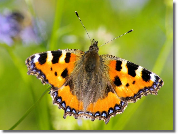 This Small Tortoiseshell butterfly looks as though it is in mid air but it's actually resting on a small flower which is out of sight underneath it.