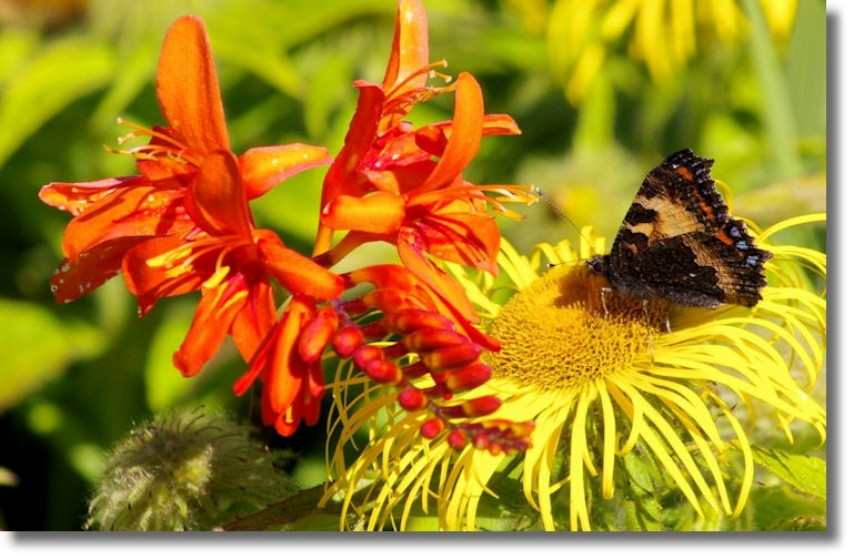 The UK Meteorological Office has reported that overall in the UK this summer (June, July and August) has been the wettest since 1912. As a result of all that rain (and lack of sunshine too) butterflies have been hard to find so it was a pleasant surprise to find small tortoiseshell such as this one in some numbers at Culzean on this visit. Of course, the sun was shining that day and that would encourage them to come out. This butterfly was feeding on an Inula flower, with Crocosmia adding a splash of bright colour too.
