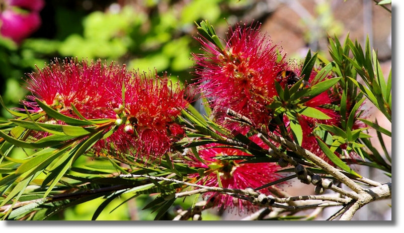 Callistemon are commonly referred to as bottlebrushes because of their cylindrical, brush like flowers resembling a traditional bottle brush. They are found in the more temperate regions of Australia, mostly along the east coast and south-west, and they typically favour moist conditions when planted in gardens (Scotland can supply plenty moisture most of the time!) The flowers have hardly any petals the main feature is a mass of stamens, with the pollen at the tip of the filament.
