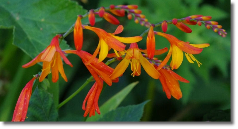 Crocosmia (known in the United States as copper tips or falling stars, and in the United Kingdom by the common name of montbretia) produces these orange , red or yellow flower sprays from its sword-like foliage in late summer or early autumn. These days, crocosmia are grown in all parts of the world but they do prefer a rich, moist but well-drained soil in sun or light shade. Some of the varieties can become invasive and spread in an uncontrolled fashion.