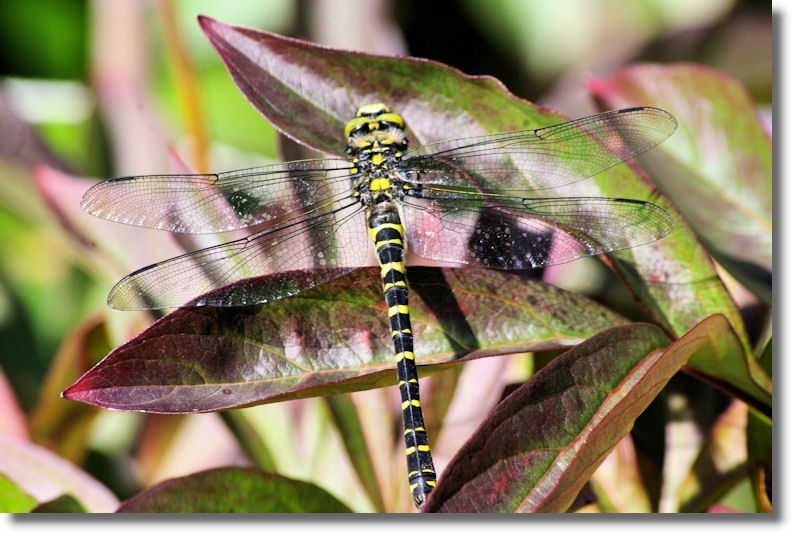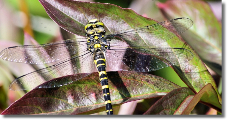 Golden-ringed Dragonflies are easily identified by their distinctive black and yellow stripes. Its length is up to 3 inches (8cm). The female is slightly longer than the male (this is a male) and is the longest British species of dragonfly. They are voracious predators, feeding on large insects such as damselflies, other dragonflies, wasps, beetles and bumblebees. In the UK, it is also found in Scotland, Wales and the south-west of England.