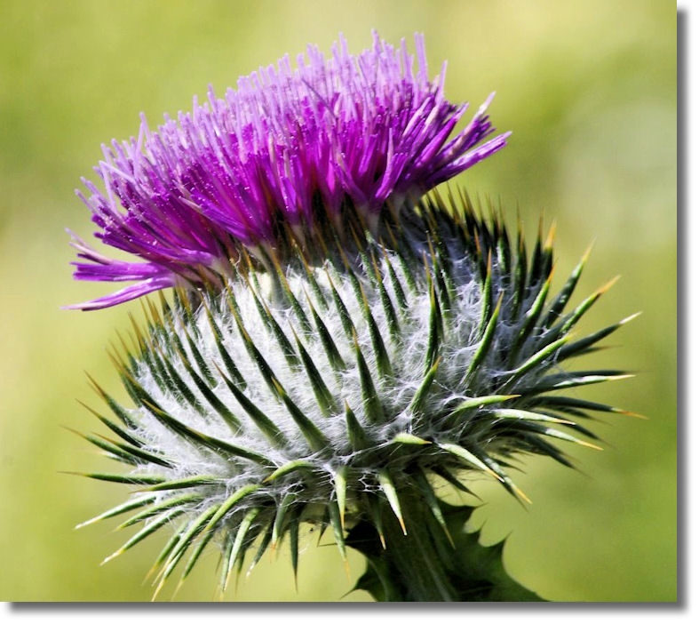 Onopurdum is an impressive thistle plant that grows to around eight feet or more and one of the borders in the walled garden at Culzean always has several of them on display each year. It is actually a biennial so the plant only has some spiky leaves in the first year before producing these large flowering heads in the second year. These produce seeds which can start the cycle going again the following year. The botanical name is derived from the Ancient Greek words onos (donkey), perdo (to consume), and acanthos (thorn), meaning 'thorny donkey food'. It is also known as "Cotton Thistle" due to the cotton-like hairs on the leaves. Other names include woolly thistle and Scots or Scottish thistle or heraldic thistle (due to its use in Scots heraldry).