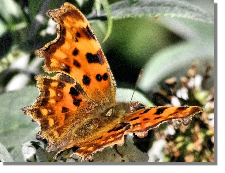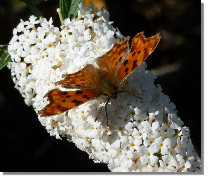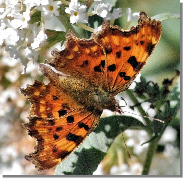 This picture was taken on the first day we had seen the Comma in our garden. It had found some white buddleja (a popular name for this shrub is "Butterfly Bush") which still had some flower spikes - most of them had flowered earlier and started to wither.
