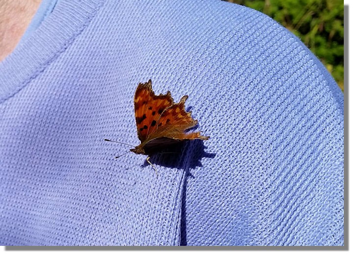 Butterflies have a habit of landing on my wife and basking in the sun for a wee while. Which gives the perfect opportunity for a picture - especially as this Comma was not staying in one place for long anywhere else, making it very difficult to get any other pictures of it!