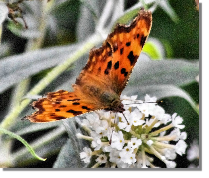Another view of the Comma on the Buddleja. The Comma's scalloped, ragged wings with black marks on an orange-black background make it a most attractive butterfly.