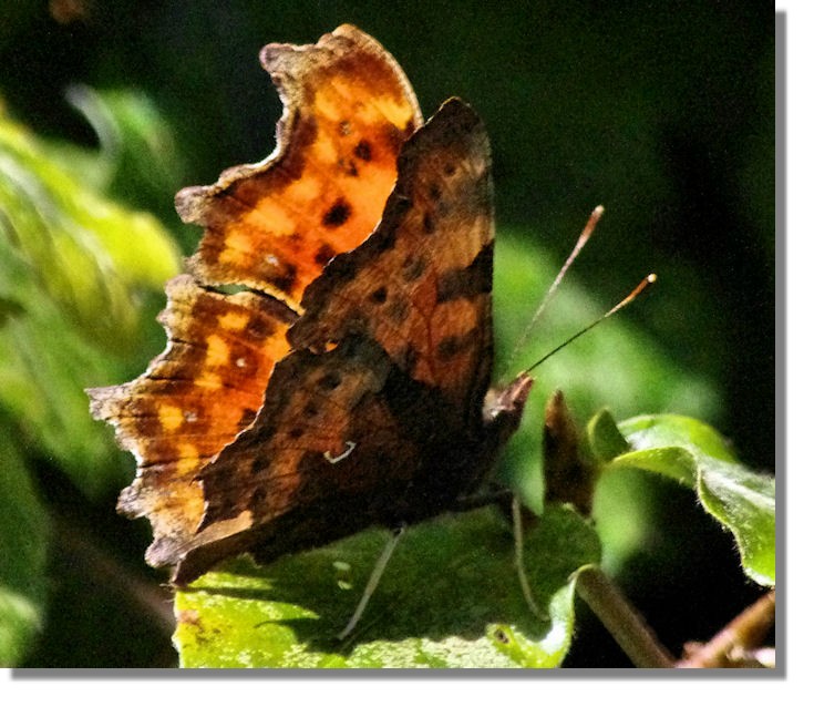 The Comma name derives from the white marking on the dark underside of its wing. The brown underside provides camouflage for hibernating as the wings look like dried leaves when folded. This picture was taken when the Comma flew up into a beech hedge - it was probably trying to get some warmth from the sun at that point.