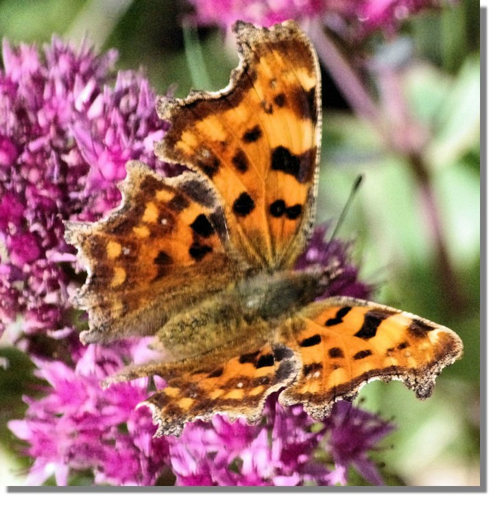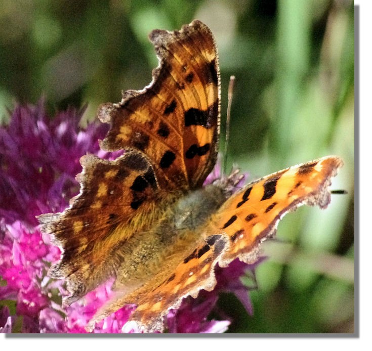 Here's the Comma again on the Sedum flowers with its wings spread out this time as it enjoyed not only the nectar but the warmth of the sun on that day.