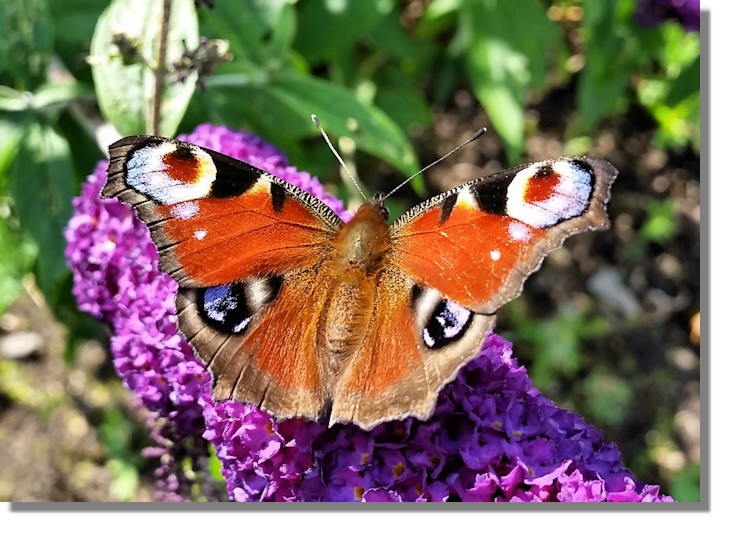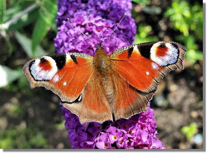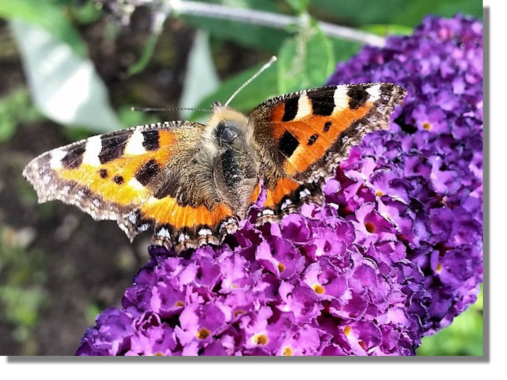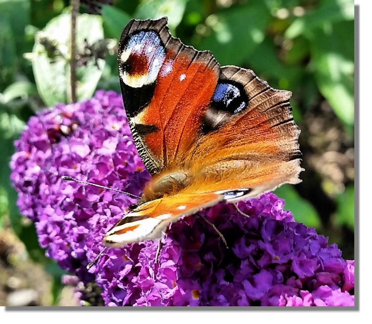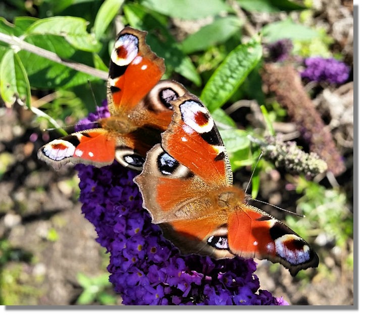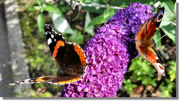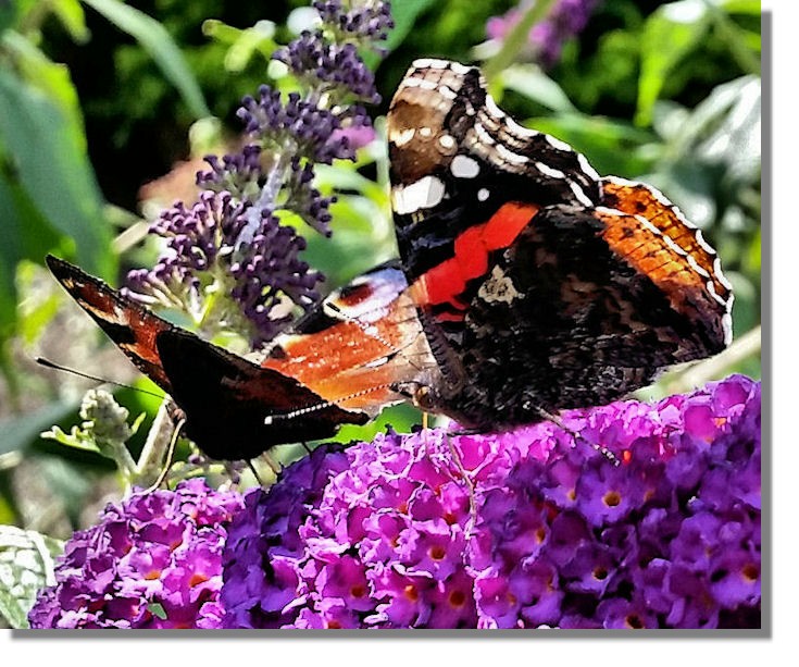 After the mild winter and good spring I had expected this to be a good year for butterflies. But instead I have seen disappointingly few numbers this summer, apart from the ever-present Green Veined Whites. So it was particularly pleasing to find the sunshine bringing out so many butterflies that they had to compete for space. Sometimes, a flick of their wings would cause one of them to fly away but these two busily probed the buddleja flowers together.