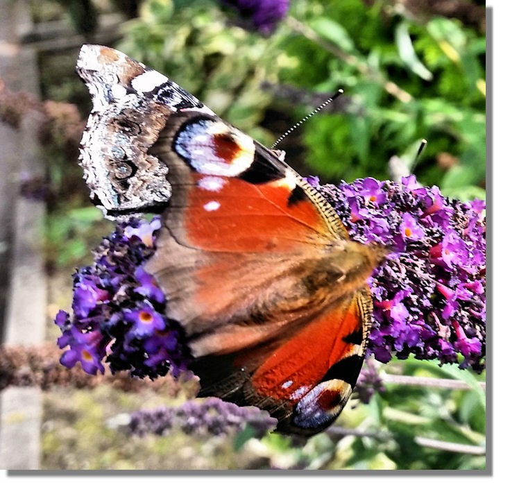 This odd-looking picture arose because there is the underside of a Red Admiral butterfly with wings folded behind the Peacock as they both fed on the same flower spike.