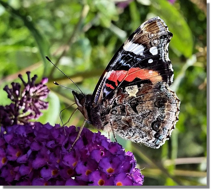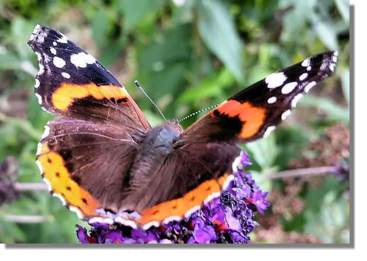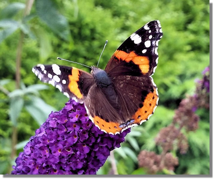 The Red Admiral is a black/brown butterfly, with a flash of vivid orange-red across its forewings and around the edge of its rear wings and a splatter of white spots towards its wing-tips. It is a common sight in Scottish gardens during mid-late summer.