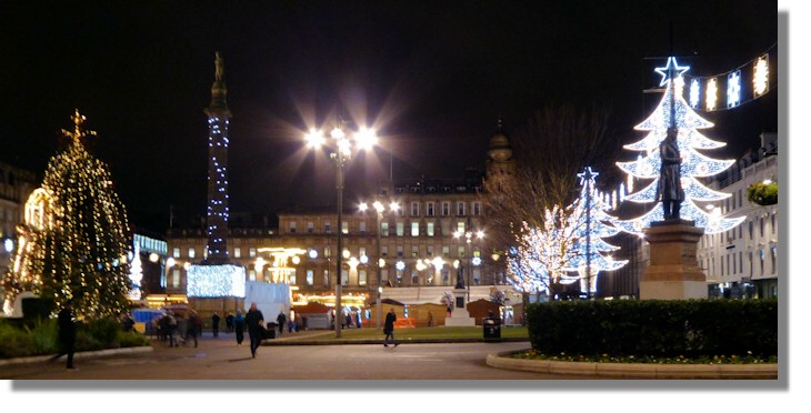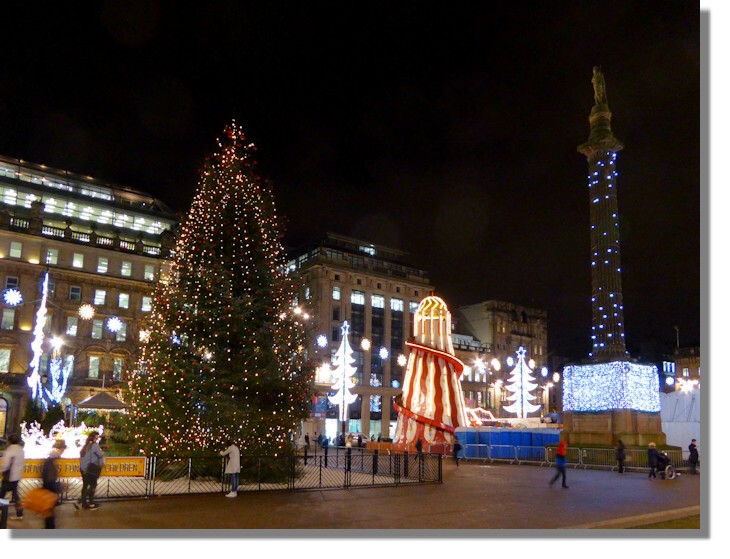 The Christmas offering in George Square has been considerably changed with the removal of the ice rink and the addition of "Christmas Market" stalls which used to be confined to the smaller St Enoch Square. But thankfully the large (60ft) decorated Christmas Tree has been retained and so has the "Helter-Skelter" slide. The lights on the column supporting the statue of Sir Walter Scott has flashing bulbs.