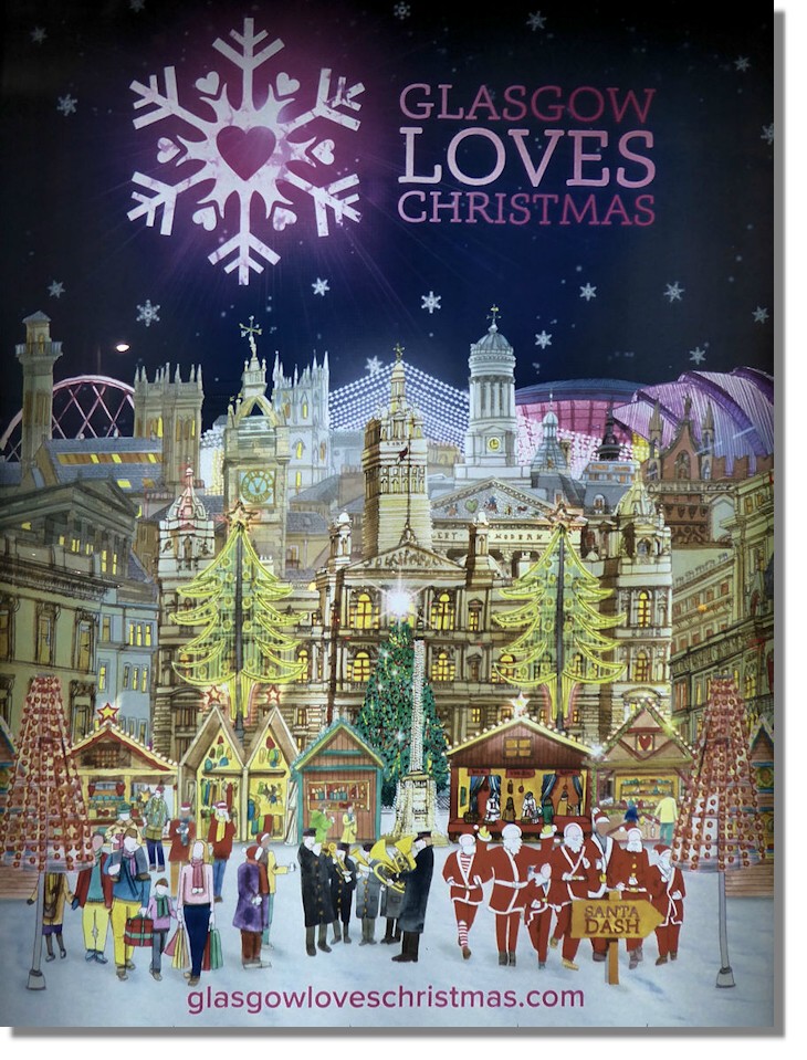This was a poster encouraging people to visit the Glasgow Loves Christmas Web site which provides a guide to "What's On", Shopping and visiting Glasgow. Their graphic illustrates in a compact form many of the sights in central Glasgow. There are pages giving more detail of the "Glasgow Santa Dash" race, the Glasgow Christmas Markets and Shopping - claiming that the City "has the best shopping in the whole of the UK outside of London".