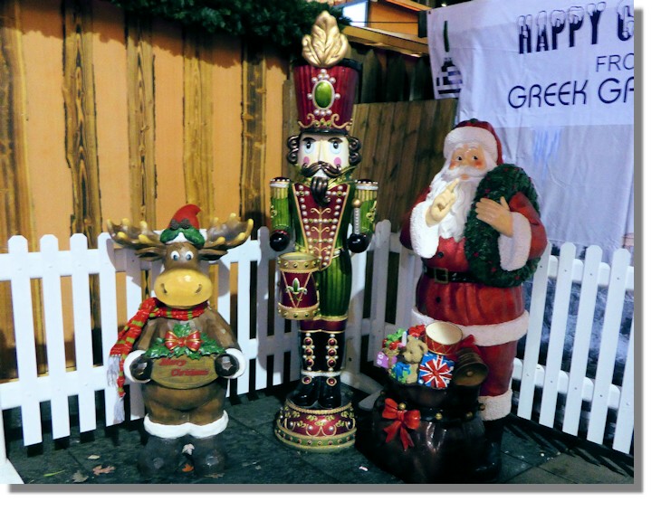 In recent years there have been market stall set up in St Enoch Square just off Argyll Street, providing fast food and Christmas gifts. These were not a patch on the extensive Christmas market stalls in Princes Street in Edinburgh but they have now been considerably expanded not only in St Enoch Square but in George Square as well (where there is no longer an ice rink at Christmas). Many of the stall owners come over from Europe (I wonder if they will still be able to get visas once the UK has left the European Union?). I was amused that these Christmas figures had been set up beside a wish for a Happy Christmas from the "Greek Grill" selling hot Greek food!