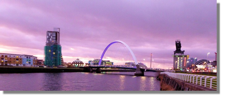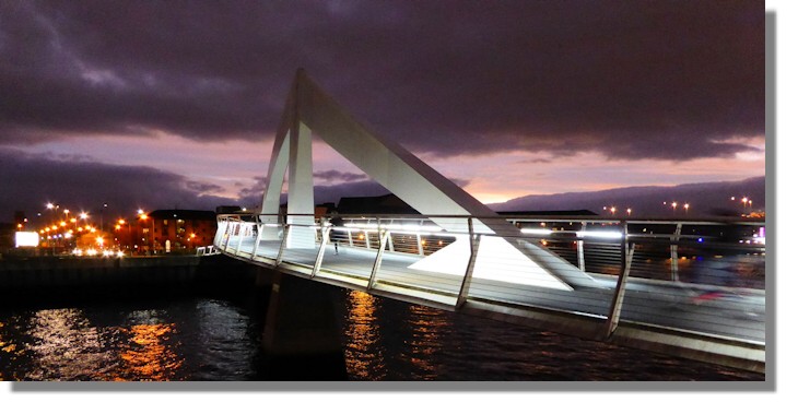 The Tradeston Bridge (known locally as the "Squiggly Bridge" due to its horizontally curved design in an S shape with outward canting on both curves). It is used by pedestrians and cyclists with no motorised traffic being allowed on it.