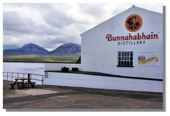 Bunnahabhain Distillery has a lovely outlook across the Sound of Islay to the Paps of Jura. Bunnahabhain is one of the most remote distilleries in Scotland and is located at the end of a long, single-track road. While there are passing places on the road, meeting a large truck thundering south from the distillery while turning a corner can be an exciting experience!