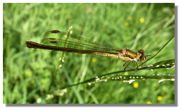 All that water encourages the local damsel flies, which are similar to dragonflies, but the adults can be differentiated by the fact that the wings of most damselflies are held along, and parallel to, the body when at rest. In addition, the hindwing of the damselfly is essentially similar to the forewing, while the hindwing of the dragonfly broadens near the base. Damselflies are also usually smaller than dragonflies and weaker fliers in comparison, and their eyes are separated.