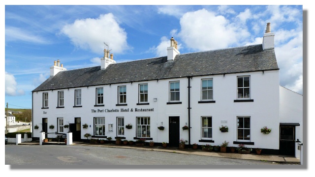 Port Charlotte is a charming village overlooking Loch Indaal, with lots of white-washed cottages. Many are now holiday homes - known locally as "unlit houses" as they are often unoccupied. In addition to Port Charlotte Hotel, seen here, there are a number of other places to eat in Port Charlotte and cheeses can be obtained from the local creamery. Port Charlotte is a stronghold of the Gaelic language and the signs for its street names are in Gaelic.