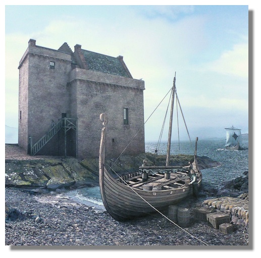 Although some restoration work was carried out on the building by British Nuclear Fuels after they had built a nuclear power station further up the coast at Hunterston, Portencross Castle was in danger of collapse. A local charity, Friends of Portencross, began efforts to raise money to preserve the building for future generations. Conservation work started in 2009 with support from the Heritage Lottery Fund, Historic Scotland and the Architectural Heritage Fund. The castle is now open to the public and there are displays within the building showing its history - including the imaginative painting seen above of a Viking galley beached beside the castle. Of course, although Vikings did arrive on these shores, it was long before Portencross castle was built.