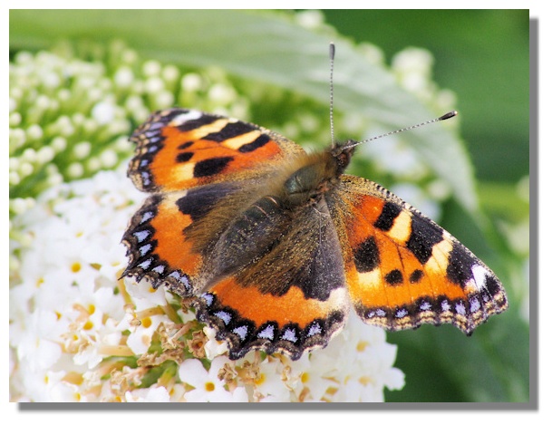 In July, the UK's Butterfly Conservation organisation runs a "Great Butterfly Count" during which members of the public are asked to report to an on-line survey site on the number and type of butterflies seen anywhere in the UK. The count was supposed to be the last two weeks of July but the weather in the first week was so bad (and butterflies largely only come out in sunshine) that the period was extended to take in the first week of August as well. That seemed like a good idea, especially in Scotland where butterflies tend to emerge later than down in England. So our visit to Drummond Castle was in part prompted by the hope of seeing some butterflies as the forecast was for sunshine and in previous years Drummond Castle Gardens had been a good place to see them. There were not exactly clouds of butterflies this time but there were a couple of Small Tortoiseshells - this one was on a white Buddleja bush.