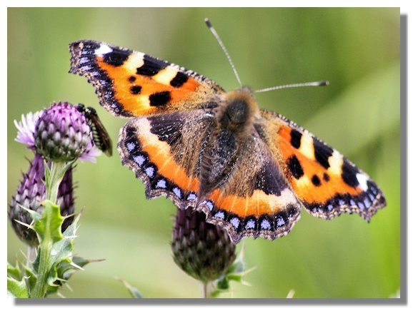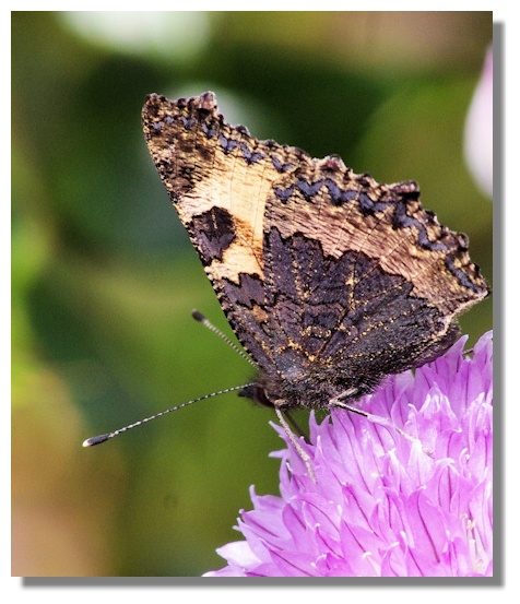 The underwings of the Small Tortoiseshell butterfly are dull, looking like a dried leaf at a distance, which helps to conceal stationary or hibernating individuals. But seen in close up, they create an interesting pattern. When threatened, resting Small Tortoiseshell rapidly open and close their wings, presenting a dramatic display of colours which can frighten off predators - or other insects competing for nectar.