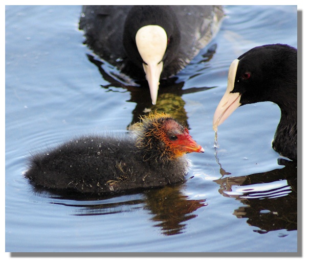 Coots sometimes manage to raise two broods in the summer and it is possible that this very young chick is the second family these birds have raised this year. This was actually the first time this year that I had seen a baby Coot close up - earlier in the year the newly hatched birds were kept away from the edge of the water and the parents trudged back and forward with any bread firmly fixed in their beaks to take it to their offspring!