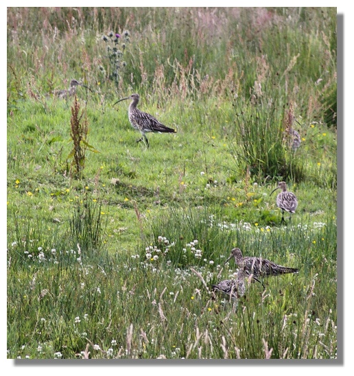 Curlews feed on mud or very soft ground, searching for worms and other invertebrates with their long, down curved bills. Their mottled plumage gives them excellent camouflage - can you find the six birds in the picture?