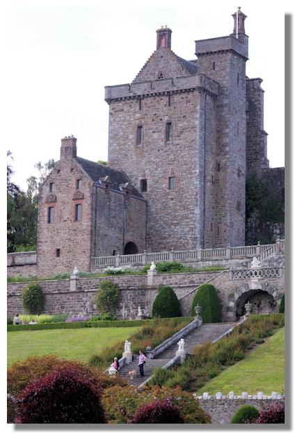 Visitors are not allowed in Drummond Castle itself - but the magnificent gardens keep everybody well satisfied. The gardens at Drummond Castle have a long history - there are records of Lord Drummond sending cherries to King James IV in 1508. Over the centuries, the garden has been remodelled several times. The 4th Earl Drummond was a well known agricultural improver at the end of the 17th century - he had a plan to grow an avenue of trees all the way from Drummond Castle to Perth - twenty miles away! He had to make do with a mile long avenue of beech trees leading from the main road to his castle. In the 19th century Lewis Kennedy (who had previously worked for the Empress Josephine at Malmaison in France) was engaged as Factor for the estate. It was Kennedy who created a formal flower garden. Lewis Kennedy's son created a new design in 1838 and when Queen Victoria and Prince Albert visited the Drummonds in 1842, it was this layout which she saw. It is broadly this plan which is in place today, full of rose beds, box hedges and statues.