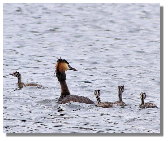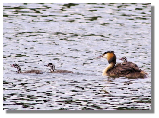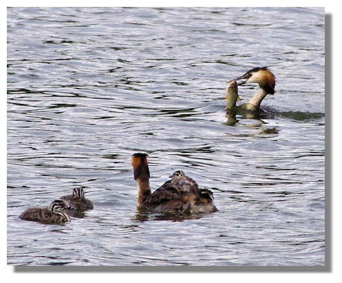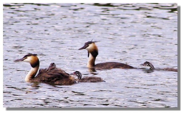 At times, there were two youngsters on the mother's back. While this must have helped the smaller birds, there were disadvantages as it was noticeable that it was the larger birds already in the water that were first in line when their father came back with a fish! Later, both parents will dive for fish and the youngsters will split into two pairs, with either mum or dad looking after their special duo.