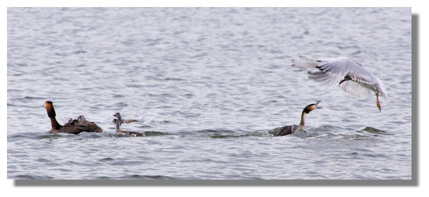 After an earlier dive, the Grebe father had been dive-bombed by a black head gull and was forced back under water. I couldn't see whether he lost the fish - or just swallowed it himself. But he subsequently resurfaced without a fish. However, he was an assiduous worker and soon came back with an even bigger fish. I was convinced that this one (a roach) was too large for a youngster to swallow but after a great deal of struggling, one of them managed it!