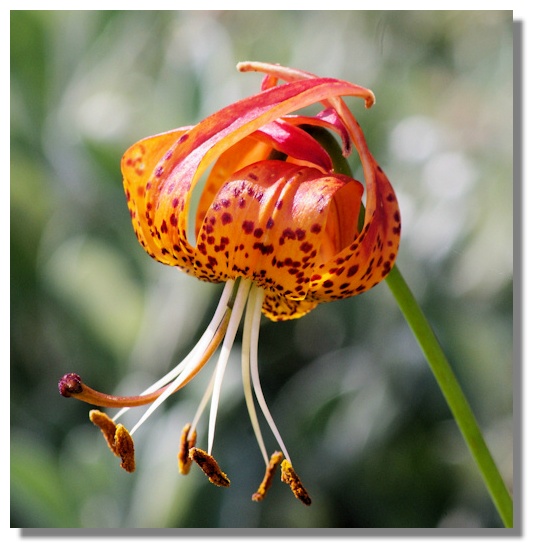 This is a variety of lily native to northern and eastern Asia, including Japan, known as Lilium tigrinum. It is one of several species of lily to which the common name Tiger lily is applied. Flowers on the plant last for a short period of time before they wither and are replaced by newer flowers. I understand it is widely planted in North America, particularly in eastern and northeastern areas.