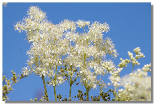 Filipendula ulmaria, commonly known as Meadowsweet, is a perennial herb that grows in damp meadows. It is native throughout most of Europe and Western Asia. It has been introduced and naturalized in North America. It is known by a range of other names including Queen of the Meadow, Pride of the Meadow, Meadow-Wort, Meadow Queen, Lady of the Meadow, Dollof and Bridewort. Meadow Sweet does seem appropriate however as it does have a delicate, sweet perfume.